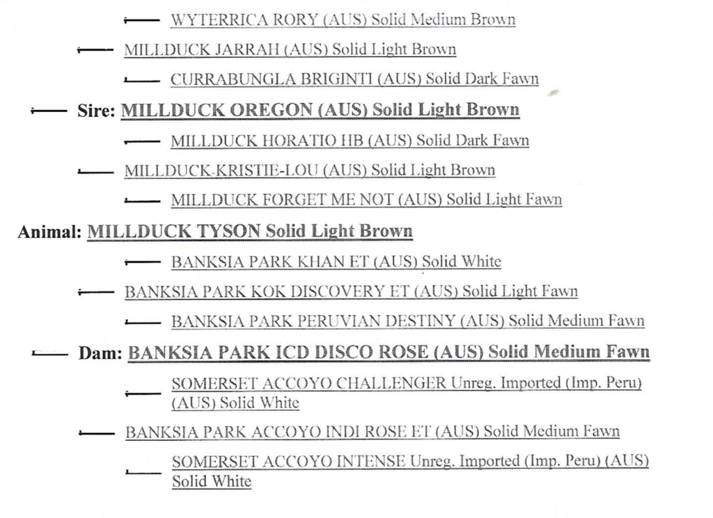 Millduck Tyson ist der Sohn von Millduck Oregon, der die australischen Shows mit über 20 Showgewinne dominierte. Weiters enthält sein excellenter väterlicher Stammbaum Jarrah, Conquistador, Highlander, Ultimo, Auzengate und Brigantine.