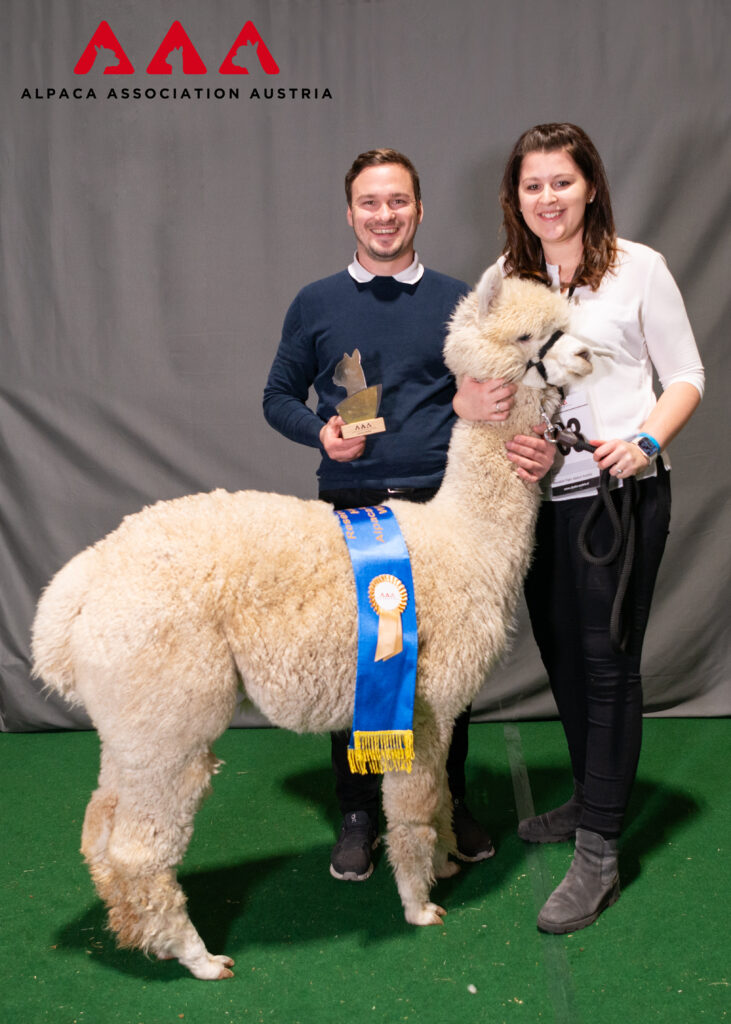 Sein Vater, Stoney Meadows Genesis, ist ein weißer Ausnahmehengst aus Neuseeland, der sagenhafte 10 Supreme Champion Titel erringen konnte – ein Meilenstein in der internationalen Alpakazucht.