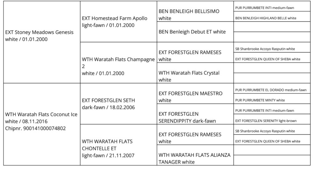 Waratah Flats Merlin ist nicht nur unser erfolgreichster Hengst – er ist ein Garant für Qualität im Showring und in der Zucht. Jahr für Jahr begeistern seine Nachkommen mit außergewöhnlichem Typ, beeindruckender Vliesqualität und einem Auftritt, der Richter überzeugt. Zahlreiche Titel von Grand Champion bis hin zu Best of Show sprechen eine deutliche Sprache: Merlin vererbt Spitzenqualität mit bemerkenswerter Konstanz.