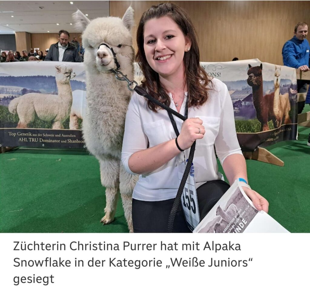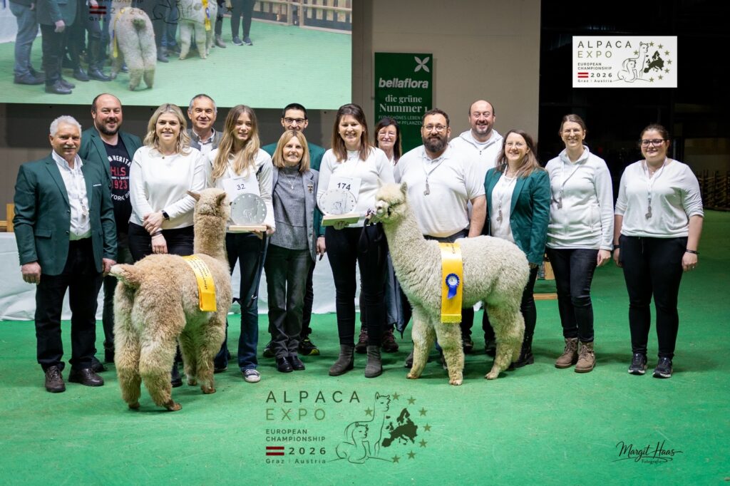 Eine seiner herausragenden Nachkommen ist Grace. Ihr Vlies überzeugt durch außergewöhnliche Gleichmäßigkeit, beeindruckende Feinheit, hohe Dichte sowie wunderschönen Glanz. Ein klar definierter, gleichmäßiger Crimp rundet das Gesamtbild ab und unterstreicht eindrucksvoll die konstante Vererbungskraft von Waratah Flats Merlin. Alpakashow Wieselburg 2024: 1 Platz, Color Champion und Reserve Grand Champion (Judge: Nick Harrington- Smith) Alpaka Expo Fleeceshow 2025: 1 Platz, Reserve Color Champion und Reserve Grand Champion Punkte 87,29 (Judge: Barbara Hetherington)
