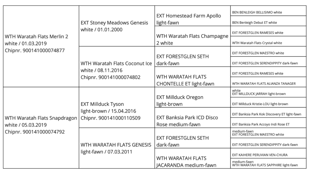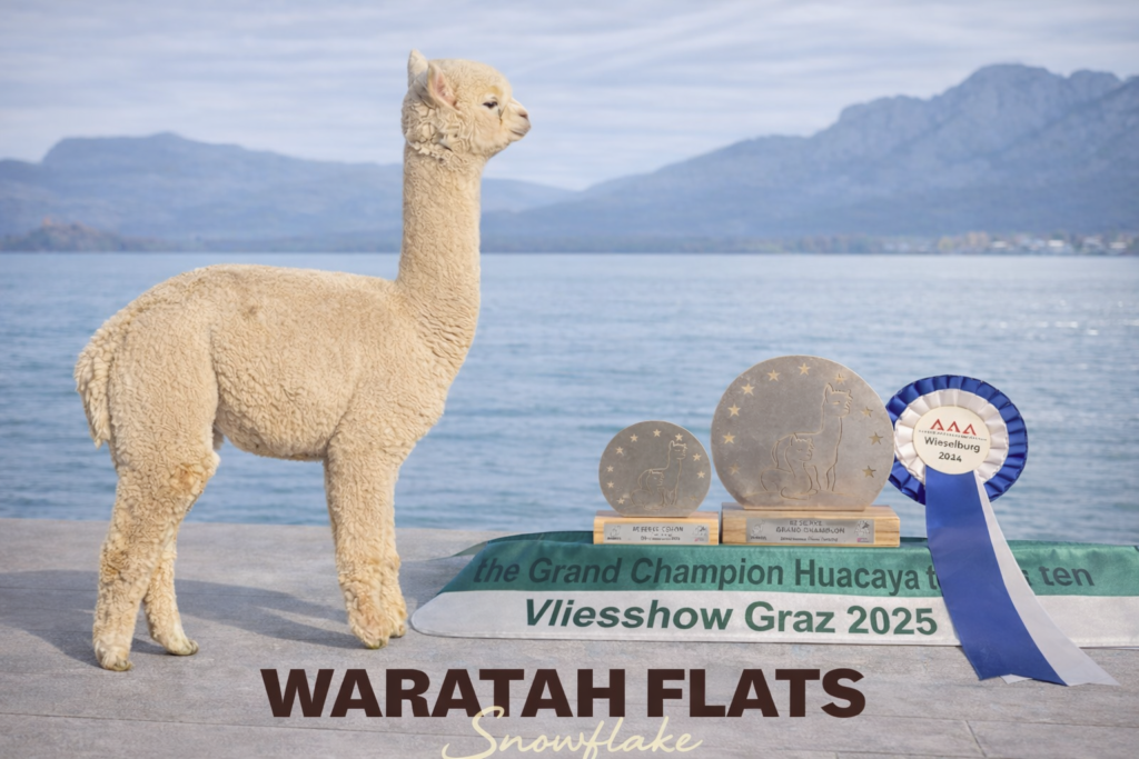 Seine Mutter Snapdragon zählt zu unseren besten weißen Stuten und steht für Konstanz, Feinheit und Dichte in der Zucht. Sein Vater Waratah Flats Merlin ist ein bewährter Vererber, dessen Nachzucht sich regelmäßig auf Shows behauptet – mit Titeln von Color Champion bis Reserve Grand Champion. Kaum ein Merlin-Nachkomme blieb bislang ohne Auszeichnung.